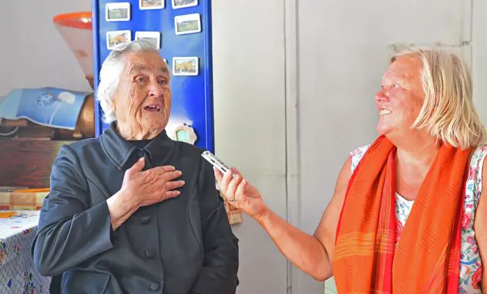 „Seit 60 Jahren arbeite ich hier in Geschäften. Mein Mann ist vor langer Zeit an der ‚schlimmen Krankheit‘ gestorben. Ich bin in Kosmas geboren, die Familie hatte viele Kinder. Mein Vater war Schäfer, ich bin nie zur Schule gegangen, das war damals nicht üblich. Mein Vater konnte aber lesen und schreiben. Als ich geheiratet habe, haben wir ein Geschäft aufgemacht. Wir hatten allerdings nie ein eigenes Geschäft, immer nur zur Miete. Ich habe mir die Zahlen immer gemerkt, ich mache das bis heute alles im Kopf. Jetzt bekomme ich eine kleine Rente. Meine Mutter hat mit 14 geheiratet, mein Vater hatte sie entführt. Sie hat viele Kinder bekommen, darunter zwei Bäuche mit zweien (Zwillinge). 1940 ist sie gestorben. Da war ich sieben. Sie hat acht Mädchen und drei Jungen hinterlassen. Meine größeren Geschwister haben uns aufgezogen, meine große Schwester ist jetzt 97. Einige meiner Geschwister sind ins Ausland gegangen, nach Australien, Amerika, Argentinien. Zwei der Schwestern hat ein Cousin meines Vaters, der keine Kinder hatte, nach Amerika geholt. Die Zwillinge waren damals gerade mal vier Jahre alt. Die Kleinen waren vor Hunger krank, ihre winzigen Körper hatten sich regelrecht verdreht. Einmal sind vor Jahren fast alle Geschwister hierhergekommen, das war schön. Wir telefonieren oft.“