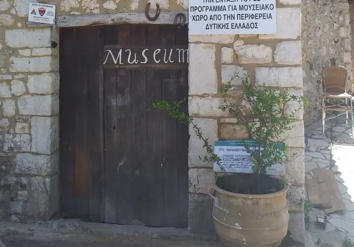 Ein weiterer Lockvogel ist das neu eingerichtete Museum. Es liegt an der Hauptstraße, dem einzigen Durchfahrtsweg in Monasteraki. Der schöne Steinbau ist nicht zu verfehlen. Vor dem Hofeingang gibt es eine kleine Erhebung mit drei, vier Kaffeestühlen und mit einem kioskgroßen Anbau ans Haupthaus, in dem Pitas, Kaffee, Ouzo, kühles Bier und sonstige Leckereien angeboten werden. Die hausgemachten Pitas sind übrigens eine Delikatesse. Durch einen steinernen Rundbogen kommt man in den Innenhof, der am Fluss liegt. Auch hier fließt eine Quelle aus dem Gestein. Ich sitze mit meiner Freundin Joan unter dichten Baumkronen, in den starken Ästen über uns sehen wir bronzegrünen Rosenkäfern bei ihren Annäherungsspielereien zur Paarung zu. Die Frau aus dem steinernen Kiosk stellt einen vom eiskühlen Wasser beschlagenen Krug vor uns auf dem Tisch ab, zwei Fläschchen Ouzo und einen Teller mit mundgerechten Pitahäppchen. Wann die Taverne im Innenhof geöffnet sein wird? Wann das Museum? In zehn Tagen, sagt die Frau kurz angebunden, während sie uns mit ihrem zwischen Schulter und Ohr eingeklemmten Mobiltelefon bedient. Sie hilft heute aus.