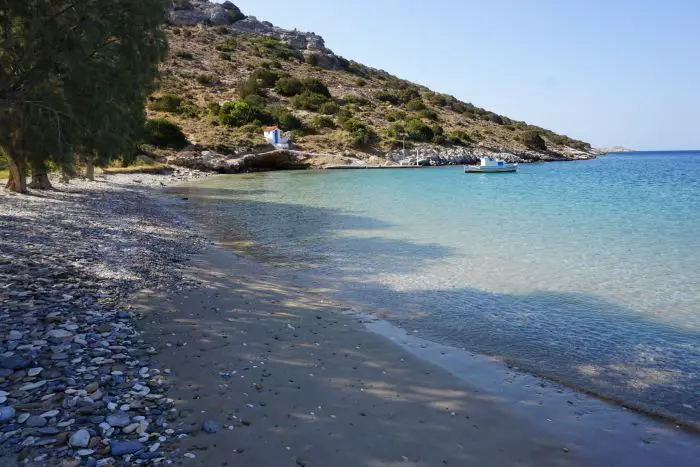Während unseres Urlaubes auf Fourni besuchten wir viele Buchten, umrundeten die Insel, entdeckten weit abgelegene Bergdörfer und sprachen mit vielen Einheimischen. Die Insel war für uns ein Traum. Obwohl es erst Anfang September war, war weit und breit kein Tourist zu sehen. Nur in der Inselhauptstadt sah man einige Urlauber, sonst nichts. In den anderen Orten der Insel herrscht Stille. Wie ausgestorben wirkten die kleinen Dörfer. Nur Katzen waren auch hier unsere ständigen Begleiter. Fourni ist von relativ seichtem Meer umgeben. Es geht selten sofort tief ins Wasser. Dadurch, dass die überwiegende Anzahl der Buchten durch die hohen Felswände geschützt ist, spürt man den Wellengang weniger, ebenso den Wind – an einigen Stellen sogar so gut wie gar nicht. Jeden Morgen suchten wir uns eine andere Bucht zum Schwimmen aus. Oft muss man auf Fourni einige Meter hinab zum Strand zu Fuß laufen. Dann warten glasklares Wasser, mehr oder weniger große weiße bis bunte Steine, bizarre Felslandschaften, kleine Fischschwärme, Seeigel und Seesterne auf den Badegast. Unsere Lieblingsbucht war Petrokopio in der Inselmitte – ein Strandabschnitt, den man auf einem einfachen Weg, vorbei an Überresten eines antiken Steinbruchs, erreicht. Am kleinen Strand warten dann etliche Tamarisken, die Schatten spenden, und ein kleiner Steg für Fischerboote. Diesen Abschnitt kann man auch über eine schmalere Piste mit dem Auto erreichen. Die antiken Überreste des Steinbruchs sind sehr sehenswert, auch wenn nicht viel davon übriggeblieben ist. Aber man sieht noch heute halbbearbeitete, strahlendweiße Marmorsäulen, von denen die größte einen Durchmesser von 1,90 Meter besitzt, sowie unfertige römische und archaische Sarkophage.