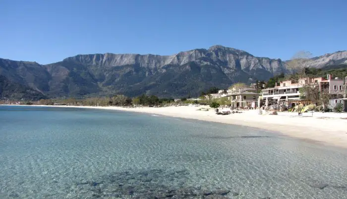 Dankend nehme ich die Karte und Zeichnungen an mich, steige aufs Motorrad und verlasse Limenas. Heute möchte ich die Ostküste erkunden und beginne mit dem berühmten Golden Beach. Vorbei an einem gigantischen Marmorsteinbruch führt die Straße zunächst durchs Binnenland. Die Straßen der Insel sind meistens kurvig, in gutem Zustand und bereiten nicht nur Motorradfahrern Freude. Im Ort Panagia angekommen, biege ich nach links ab Richtung Skala Panagias – zum Golden Beach. Man trifft häufig auf weiter im Landesinneren gelegene Orte, von denen es einen Ableger am Meer gibt, dem das Wort Skala (Anlegestelle) oder Ormos (Ankerplatz) vorangestellt ist. Es war den Inselbewohnern früher nicht möglich, ihre Siedlungen am Meer zu errichten, die Überfälle der Piraten waren zu gefährlich. Erst nachdem diese Gefahr gebannt war, trauten sich die Menschen in Meernähe. Der zeitliche Unterschied der Bebauung ist deutlich zu sehen. Natursteinhäuser, oft mit Steinplatten gedeckt in den Bergen, moderne Gebäude am Strand. Der Golden Beach ist einer der bekanntesten Strände von Thassos, im Sommer manchmal überfüllt, momentan ist er menschenleer. Er erstreckt sich zwischen Skala Panagias und Skala Potamias. Das Wasser ist klar und sauber, kleine Wellen plätschern sanft ans Ufer – es riecht nach Meer. Der Sand schimmert wirklich golden in der Sonne. Palmen stehen in den Gärten, Bänke laden zum Verweilen ein. Viele Hotels und Pensionen werden in dieser Jahreszeit erweitert und renoviert, denn in wenigen Tagen erwartet man die ersten Touristen. In Skala Potamia endet der Strand in einem kleinen, malerischen Fischereihafen.